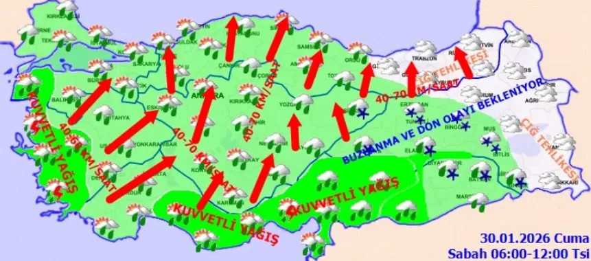 Yağışların, Kıyı Ege, Orta ve Doğu Akdeniz, Güneydoğu Anadolu'nun batısı ile Çanakkale, Manisa, Kırşehir, Aksaray, Tunceli ve Bingöl çevreleri, Balıkesir'in batı ilçeleri, Antalya'nın doğusunda kuvvetli olacağı tahmin ediliyor. Sabah ve gece saatlerinde doğu bölgelerde buzlanma ve don olayı bekleniyor. Doğu Karadeniz’in iç kesimlerinin yüksekleri ile Doğu Anadolu’nun doğusunda yüksek kar örtüsüne sahip eğimli kesimlerinde çığ tehlikesi bulunmaktadır.