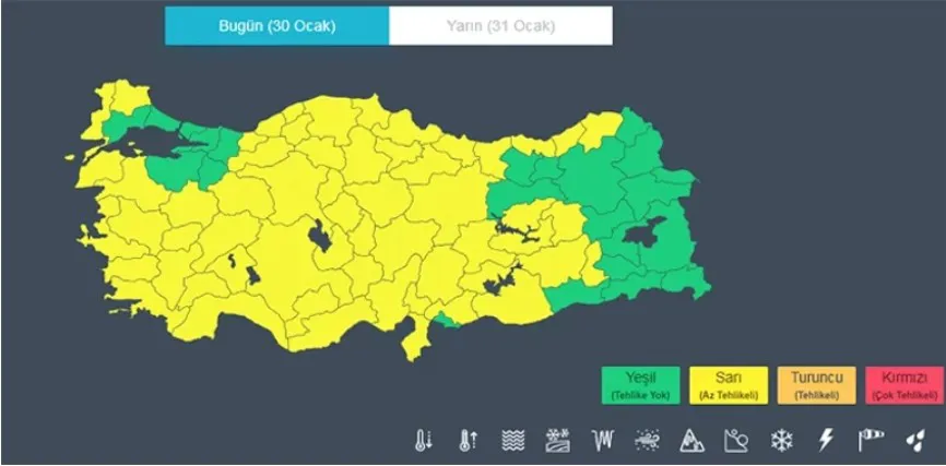 Sarı kodlu uyarı verilen iller; Adana, Adıyaman, Afyonkarahisar, Amasya, Ankara, Antalya, Artvin, Aydın, Balıkesir, Bingöl, Bolu, Burdur, Çanakkale, Çankırı, Çorum, Denizli, Diyarbakır, Edirne, Elazığ, Eskişehir, Gaziantep, Giresun, Hatay, Isparta, Mersin, İzmir, Kastamonu, Kayseri, Kırklareli, Kırşehir, Konya, Kütahya, Manisa, Malatya, Kahramanmaraş, Muğla, Nevşehir, Niğde, Ordu, Rize, Samsun, Sinop, Sivas, Tokat, Trabzon, Tunceli, Şanlıurfa, Uşak, Yozgat, Zonguldak, Aksaray, Karaman, Kırıkkale, Batman, Bartın, Karabük, Osmaniye ile Düzce.