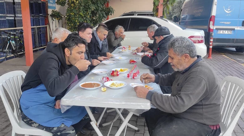 Antalya Büyükşehir Belediyesi Alanya Toptancı Hal esnafı ve çalışanlarına güne sıcak bir başlangıç yapması için çorba ikramında bulunuyor.