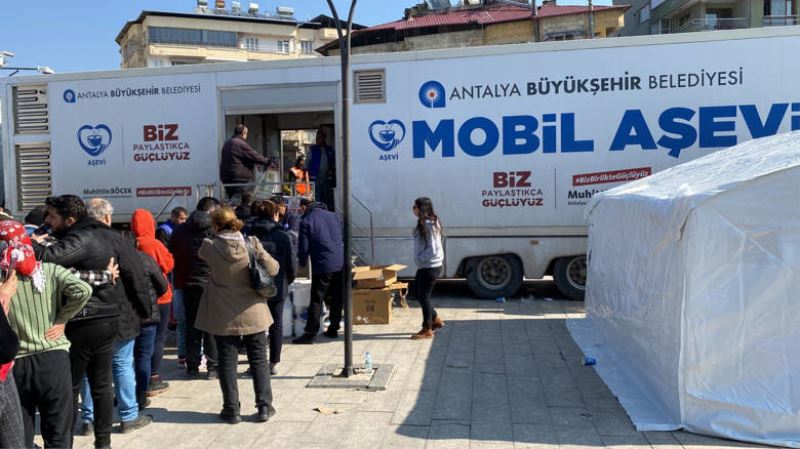 Antalya Büyükşehir Belediyesi Mobil Aşevi, Hatay Uğur Mumcu Meydanı’nda sabah sıcak çorba ikramının ardından depremzedelere öğle yemeği ikramında bulundu.