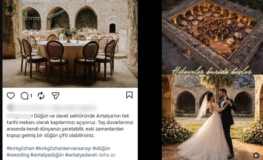 Firma, yaz sezonunda yapılacak 400 kişilik bir düğün organizasyonu için 200 bin TL + KDV ücret talep ediyor. Düğünler için 5 farklı konseptte yemek menüsü sunulduğu belirtilirken, tarihi han yalnızca düğünler için değil; çeşitli eğlence partileri ve klip çekimleri için de kiralanıyor. Organizasyon şirketinin sosyal medya duyurusunda, “Düğün ve davet sektöründe Antalya’nın tek tarihi mekanı olarak kapılarımızı açıyoruz. Taş duvarlarımız arasında kendi dünyanızı yaratabilir, eski zamanlardan kopup gelmiş bir düğün çifti olabilirsiniz” ifadelerine yer verildi.