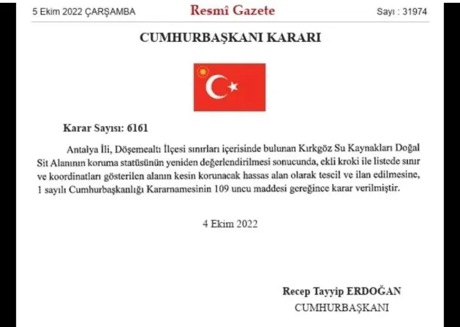 4 Ekim 2022 tarihli Cumhurbaşkanı Kararı ile Kırkgöz su kaynaklarının doğal sit statüsü güncellenerek Termessos kuyularına kadar olan bölge “Kesin Korunacak Hassas Alan” ilan edildi. Göl ve sulak alan bölümü ise “Nitelikli Doğal Koruma Alanı” olarak tescillendi. Su kaynağının yüzeye çıktığı alan tel örgüyle çevrilerek insan girişine kapatıldı. Ayrıca bölgeye yerleştirilen uyarı levhalarında, 2872 sayılı Çevre Kanunu gereğince su kaynağını kirletenlere cezai yaptırım uygulanacağı vurgulandı. Koruma altındaki su kaynağının hemen yanı başındaki tarihi handa yoğun organizasyonlar yapılması ise tartışmalarını beraberinde getirdi.