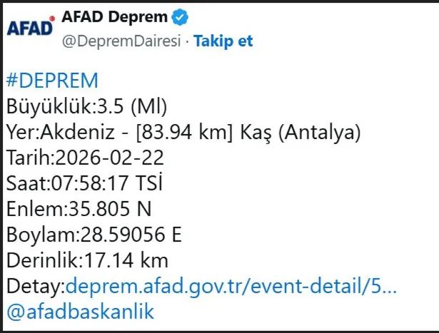 Saat 07.58’de kaydedilen sarsıntının merkez üssü Kaş ilçesi olarak açıklandı. Depremin yerin 17.14 kilometre derinliğinde gerçekleştiği bildirildi.