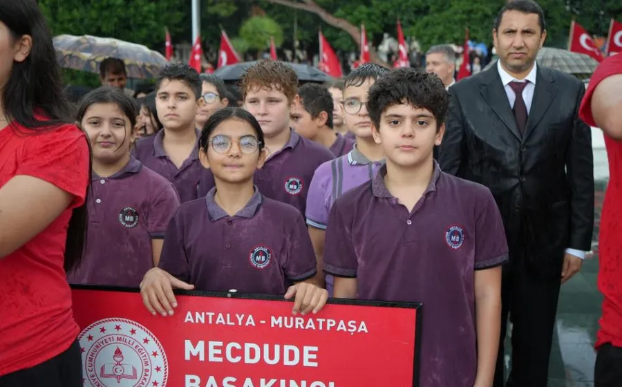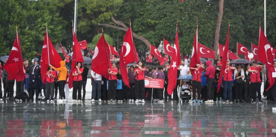 Antalya'da 29 Ekim Cumhuriyet Bayramı kutlamaları, Cumhuriyet'in kurucusu Gazi Mustafa Kemal Atatürk'ün "Efendiler, yarın Cumhuriyeti ilan edeceğiz" dediği 28 Ekim tarihinde düzenlenen çelenk sunma töreniyle başladı. Cumhuriyet Meydanı'ndaki tören, yağmurun zaman zaman doluya dönmesine rağmen coşkulu bir atmosferde gerçekleşti. Törende Türk bayrakları taşıyan öğrenciler, üzerlerine yağan şiddetli yağmura rağmen yerlerinden kıpırdamadan tören bitimine kadar görevlerini sürdürdü. Meydanı dolduran çok sayıda vatandaş da ellerinde şemsiyeler ve yağmurluklarla kutlamalara destek verdi. Protokol üyeleri ise şemsiyesiz şekilde ıslanarak çelenk sunma törenine katıldı. Antalya Valisi Hulusi Şahin, Antalya Büyükşehir Belediyesi Başkan Vekili Büşra Özdemir ve Garnizon Komutanı Tümgeneral Sinan Eren'in çelenklerini bırakmasının ardından tören, saygı duruşu ve İstiklal Marşı'nın okunmasının ardından son buldu.