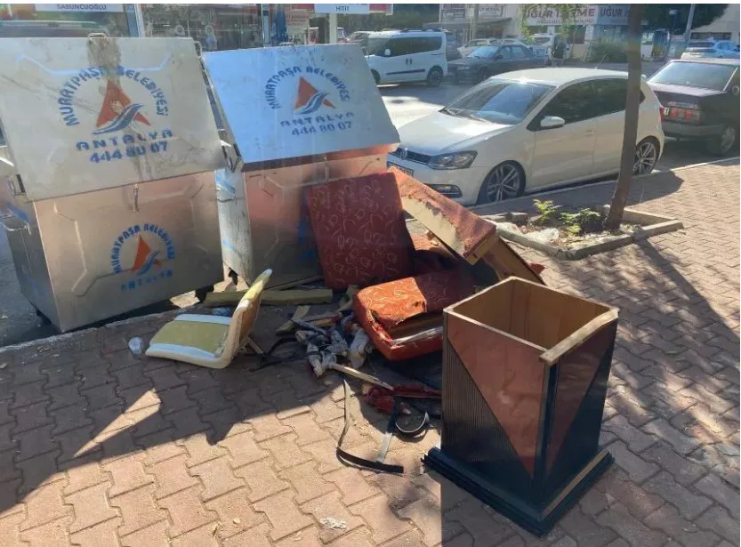 Antalya Eğitim ve Araştırma Hastanesi önünde bulunan Kazım Karabekir Caddesi her gün yüzlerce hasta ve hasta yakını tarafından kullanılıyor. Hastane girişine sadece 100 metre uzaklıkta bir çöp konteynerlerin dibinde çekilen görüntüler büyük tepki topladı. Görüntülerde kullanılmayan kanepe, koltuk ve dolap parçalarının kaldırımın üzerine bırakıldığı görüldü.