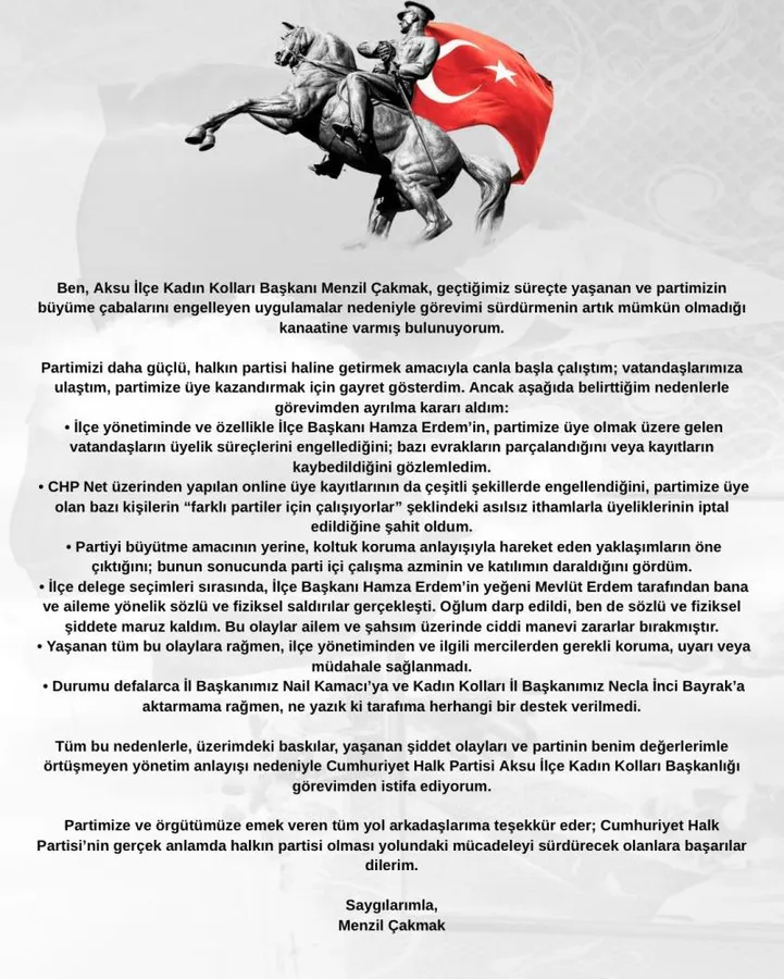 Cumhuriyet Halk Partisi (CHP) Aksu Kadın Kolları Başkanı Menzil Çakmak, görevinden istifa ettiğini sosyal medya hesabından duyurdu. Çakmak, istifasına gerekçe olarak parti içi usulsüzlük iddialarını, yaşadığı şiddet olaylarını ve ilgisizlik nedeniyle yaşadığı hayal kırıklığını gösterdi.