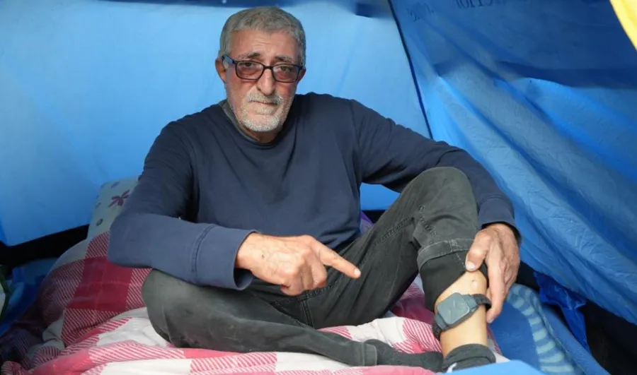 Ayağında kelepçeyle çadırda kalan yaşlı adam yaşadıklarını afiş yaptırıp çadırının arkasına astı, "Hep iyi niyetimden vuruldum. Üşüyorum, ama mücadeleme devam ediyorum" dedi.
