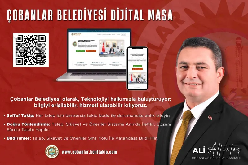 Çobanlar Belediyesi, vatandaş odaklı hizmet anlayışını teknoloji ile birleştirdi. Belediye, hayata geçirdiği Dijital Masa Sistemi ile talep, şikâyet ve önerilerin daha hızlı, şeffaf ve kolay bir şekilde iletilmesini sağladı.