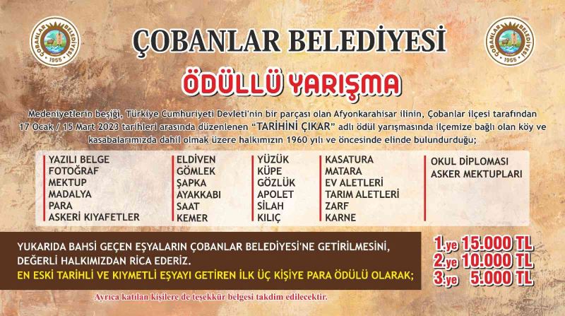 Medeniyetlerin beşiği, Türkiye Cumhuriyeti Devletinin bir parçası olan Afyonkarahisar ilinin Çobanlar ilçesi tarafından 17 Ocak / 15 Mart 2023 tarihleri arasında düzenlenen ‘‘Tarihini Çıkar ’’ adlı ödül yarışmasında ilçemize bağlı olan köy kasabalarımızda dahil olmak üzere halkımızın 1960 yılı ve öncesinde bulundurduğu; Yazılı Belge, Fotoğraf, Mektup, Madalya, Para, Askeri Kıyafetler, Eldiven, Gömlek, Şapka, Ayakkabı, Saat, Kemer, Yüzük, Küpe, Gözlük, Apolet, Silah, Kılıç, Kasatura, Matara, Ev Aletleri, Tarım Aletleri, Zarf, Karne, Okul Diploması ve Asker Mektupları bahsi geçen eşyaların Çobanlar Belediyesi’ne getirilmesini, değerli halkımızdan rica ederiz.