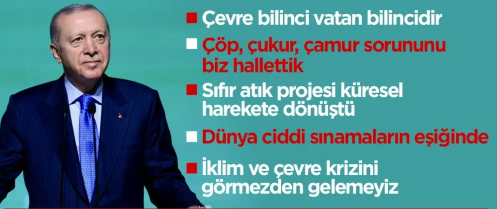Cumhurbaşkanı Recep Tayyip Erdoğan, "Çevre bilinci, aynı zamanda bir vatan bilincidir. Çevre bilinci, aynı zamanda bir varolma bilincidir. Çevre bilinci, aynı zamanda bir gelecek inşa etme bilincidir. Çevre bilinci aynı zamanda kendimizin insan olduğumuzun farkına varma bilincidir. Çevre bilinci, kainattaki dengeyi idrak etme bilincidir" dedi. Cumhurbaşkanı Erdoğan konuşmasında ayrıca, "İstanbul Büyükşehir Belediye Başkanlığımızdan beri çevre konusunda çok önemli çalışmalar içinde olduk. Hatırlayın şu kavram fakire aittir. 'Çöp, çukur, çamur.' Bunu biz hallettik. Haliç'i tekrar Boğaz'ın incisi haline getirdik. Vahşi depolamadan dolayı çöp dağlarının patladığı İstanbul'u ülkemizin en temiz şehirlerinden biri haline getirdik" ifadelerini kullandı.