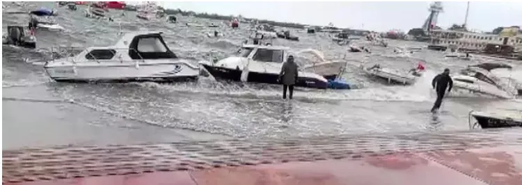 Çevrede bulunan vatandaşlar tarafından cep telefonuyla kaydedilen görüntülerinde, deniz suyunun zaman zaman sahil yoluna vurduğu; teknelerin dalgalar arasında sallandığı ve bazılarının kıyı boyunca sürüklenmekten son anda kurtulduğu anlar yer aldı.