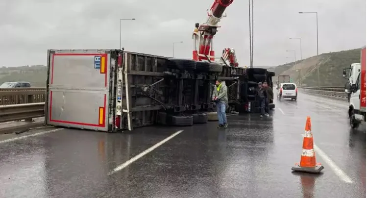 Kuzey Marmara Otoyolu'nun Kocaeli kesiminde etkili olan şiddetli fırtına nedeniyle seyir halindeki iki tır devrildi.