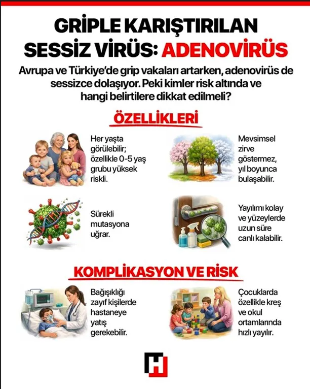 Avrupa’da ve Türkiye’de etkisini artıran grip tablosu, birçok kişide haftalar süren şikâyetlere yol açıyor. Ancak uzmanlara göre sahada dikkat çeken tek virüs bu değil. Griple sıkça karıştırılan, İngiltere’de yayılımını hızla artıran ve ülkemizde de dönemsel olarak görülen başka bir virüs daha sessizce dolaşımda: adenovirüs. Peki bu virüs ne kadar yaygın, kimler için risk oluşturuyor ve hangi belirtilerle kendini ele veriyor?