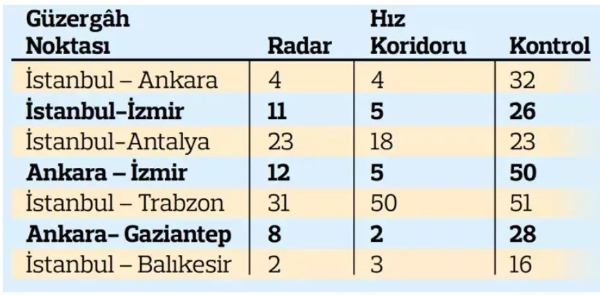 İÇİŞLERİ Bakanlığı’nın internet sisteminde hangi güzergâhta kaç adet radarlı trafik uygulaması olduğu paylaşılıyor. İşte birkaç rota üzerinden örnekler: