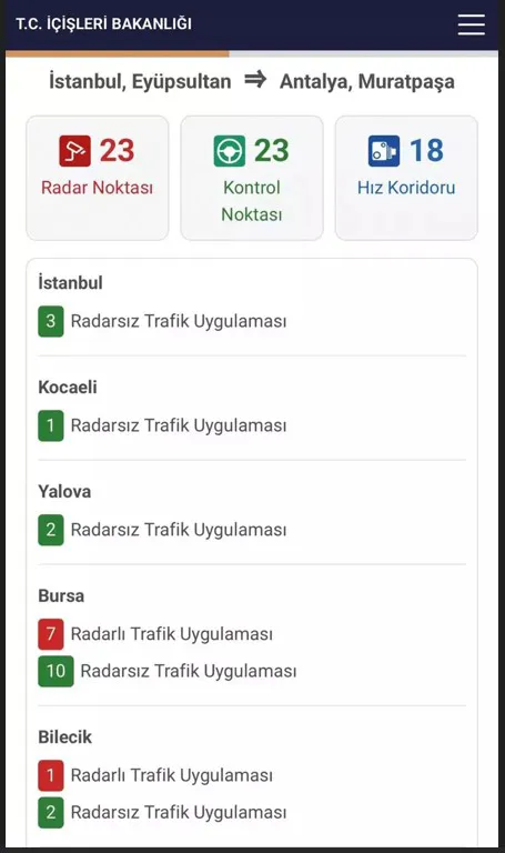 Örneğin; İstanbul Eyüpsultan’dan Antalya Muratpaşa’ya gidecek bir yolcu için gideceği rotada 23 adet radar noktası, 25 trafik kontrol noktası ve 18 adet hız koridoru olduğu görülürken bu noktaların hangi illerde olduğu da (Afyonkarahisar 7, Burdur 4, Bursa 6) aynı sayfanın altında listeleniyor.