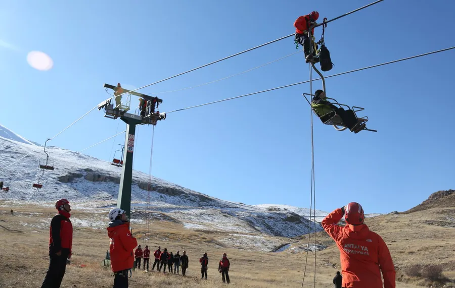 Antalya'nın Konyaaltı ilçesi Saklıkent Kayak Merkezi'nde, Jandarma Arama Kurtarma (JAK) Tim Komutanlığı koordinesinde, teleferikte mahsur kalanları kurtarma tatbikatı başarıyla tamamlandı.