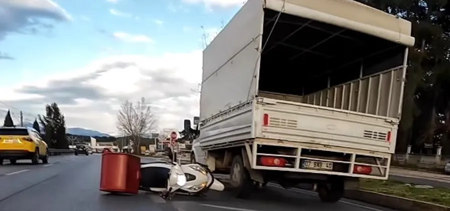 Antalya'da iki kamyonet arasından geçmeye çalışan motokurye, sarkan branda ipine takılarak yola savruldu. Kamyonet tekerlerinin altında kalmaktan son anda kurtulan motosikletlinin ölümle burun buruna geldiği anlar, kask kamerasına saniye saniye yansıdı.