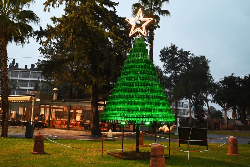 Kemer Belediyesi, 600 cam şişeyi geri dönüştürerek Mustafa Ertuğrul Aker Parkı'nda sergilenen bir yılbaşı ağacı tasarladı. Ağaç, sıfır atık bilincini artırmayı amaçlıyor.