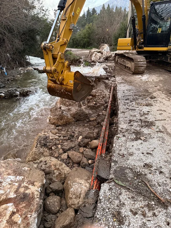 Kemer Belediyesi Fen İşleri Müdürlüğü ekipleri, şiddetli yağışlar nedeniyle Kuzdere Mahallesi Dere Caddesi'nde çöken yolu onararak trafiğe açtı.