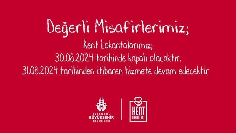İBB Kent Lokantaları, resmi tatil olması sebebiyle 30 Ağustos Zafer Bayramı'nda kapalı olacak; 31 Ağustos'tan itibaren ise hizmet vermeye devam edecek.