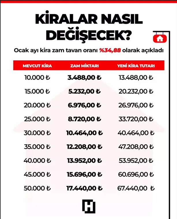 Buna göre, kira sözleşmesi ocak ayında yenilenecek olan konut ve iş yerlerinde, mevcut kira bedeline en fazla yüzde 34,88 oranında zam yapılabilecek. Bir önceki ayda da kira artış oranı aynı seviyede gerçekleşmişti. /HÜRRİYET.COM.TR