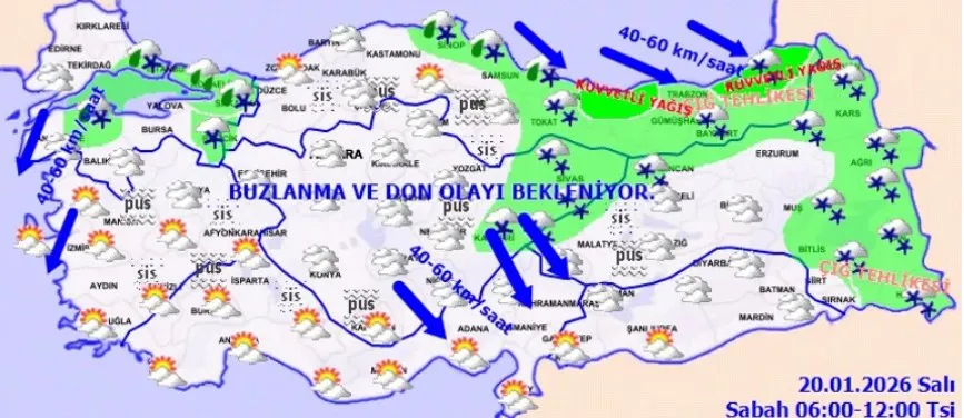 Son dakika hava durumu raporları 20 Ocak 2026... Meteoroloji Genel Müdürlüğü'nün son hava durumu tahminlerine göre, Giresun’un doğusu, Trabzon’un Doğusu ve batısı, Rize ve Artvin çevrelerinde kuvvetli ve yer yer yoğun kar yağışı bekleniyor. Marmara’nın güneybatısı, Kuzey Ege kıyıları, Orta ve Doğu Karadeniz kıyıları, İç Anadolu’nun güneydoğusu ile Doğu Akdeniz'in iç kesimlerinde kuvvetli rüzgar etkili olacak. Öte yandan İstanbul'da ise karla karışık yağmur bekleniyor. İşte 20 Ocak 2026 Salı bölge bölge hava durumu...