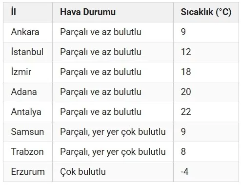 Meteoroloji'nin bugünkü rapora göre bazı illerde beklenen günün en yüksek sıcaklıkları ise şöyle: