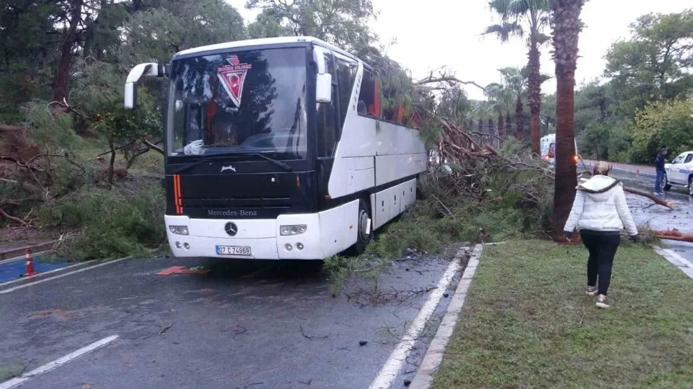 Kökünden sökülerek yola devrilen ağaçlardan bir tanesi otele gitmekte olan Soner Sümer’in kullandığı 07 J 74969 plakalı otel servisinin üzerine devrildi. Devrilen ağaç nedeniyle servis otobüsünün çatısı çökerken, serviste yolcu olarak bulunan 40 otel çalışanından 7’si yaralandı. Yaralılar 112 sağlık görevlilerinin olay yerindeki müdahalelerinin ardından hastaneye kaldırıldı. Yaralıların hayati tehlikelerinin bulunmadığı bildirildi.