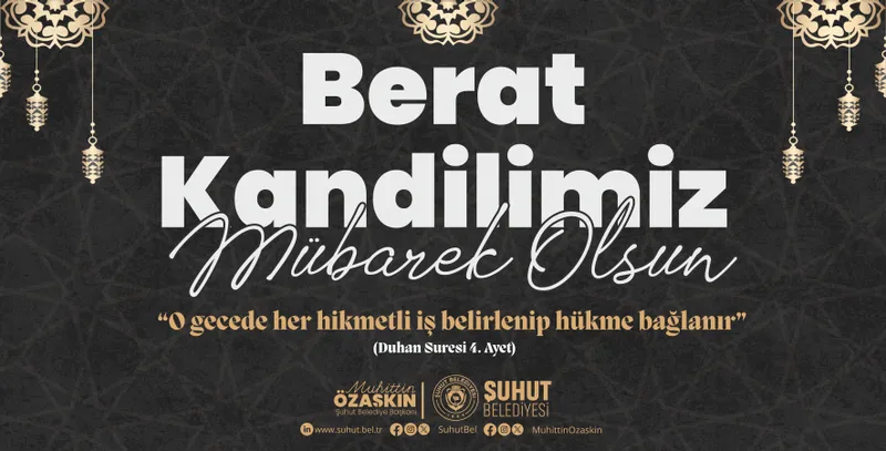 Şuhut Belediye Başkanı Muhittin Özaşkın, Berat Kandili dolayısıyla yayımladığı mesajında bu mübarek gecenin taşıdığı manevi değere dikkat çekti. Özaşkın, birlik, beraberlik ve kardeşlik duygularının güçlenmesine vesile olmasını diledi.