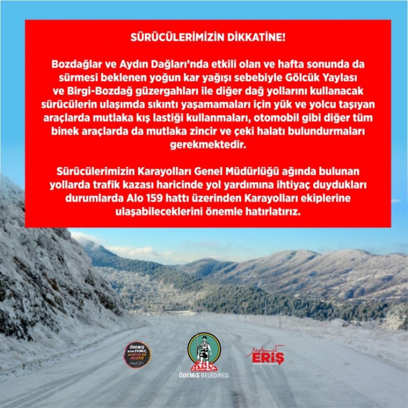 Bozdağlar ve Aydın Dağları'nda etkili olan ve hafta sonunda da sürmesi beklenen yoğun kar yağışı sebebiyle Gölcük Yaylası ve Birgi-Bozdağ güzergahları ile diğer dağ yollarını kullanacak sürücülerin ulaşımda sıkıntı yaşamamaları için yük ve yolcu taşıyan araçlarda mutlaka kış lastiği kullanmaları, otomobil gibi diğer tüm binek araçlarda da mutlaka zincir ve çeki halatı bulundurmaları gerekmektedir.