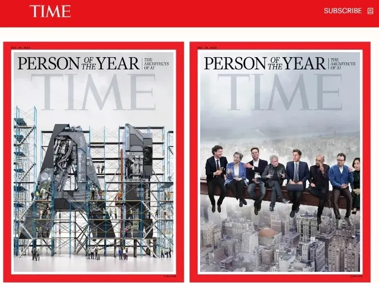 İkinci kapakta ise Time, dışı iskelelerle kaplı ve üzerinde büyük harflerle yapay zekanın İngilizce kısaltması anlamına gelen “AI” yazılı bir yapı içinde aynı teknoloji liderlerini gösterdi.