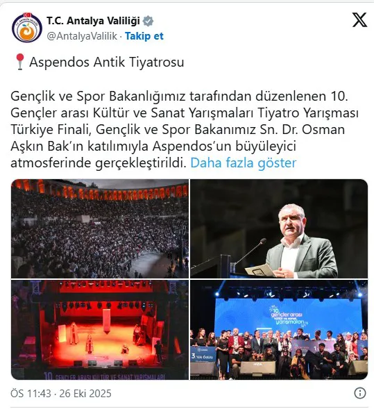 Antalya’nın tarihi Aspendos Antik Tiyatrosu, bu kez genç sanatçıların heyecanına ev sahipliği yaptı. Gençlik ve Spor Bakanlığı tarafından düzenlenen 10. Gençler Arası Kültür ve Sanat Yarışmaları Tiyatro Yarışması Türkiye Finali, Gençlik ve Spor Bakanı Dr. Osman Aşkın Bak’ın katılımıyla unutulmaz anlara sahne oldu.