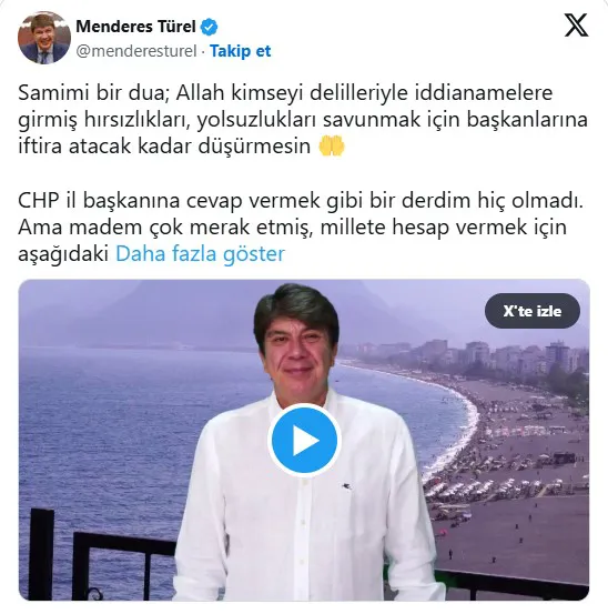 AKP MKYK Üyesi Menderes Türel ise bugün sosyal medya üzerinden yaptığı açıklama ile Kamacı’ya cevap verdi. Kamacı’ya yüklenen Türel, "Samimi bir dua; Allah kimseyi delilleriyle iddianamelere girmiş hırsızlıkları, yolsuzlukları savunmak için başkanlarına iftira atacak kadar düşürmesin. CHP il başkanına cevap vermek gibi bir derdim hiç olmadı. Ama madem çok merak etmiş, millete hesap vermek için aşağıdaki videoyu 4 Ağustos 2020 tarihinde sosyal medyada paylaşmıştık. Sn. Kamacı izlesin sorduğu konuda cevabını alır” dedi.