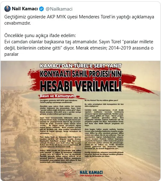 Antalya Büyükşehir Belediyesi eski Başkanı ve AKP MKYK Üyesi Menderes Türel, dün CHP Antalya İl Başkanı Nail Kamacı’nın yapmış olduğu Konyaaltı Sahil açıklamasına tepki gösterdi. Türel, 4 Ağustos 2020 tarihinde yayınlamış olduğu videoyu sosyal medya üzerinden tekrar paylaşarak Konyaaltı Sahili ile alakalı iddialara cevap verdi.