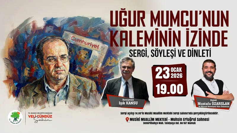 Gazeteci-yazar Uğur Mumcu, Mamak Belediyesi'nin ev sahipliğinde düzenlenecek sergi, söyleşi ve dinleti programıyla anılacak. Program, 23 Ocak 2026 Perşembe günü Musiki Muallim Mektebi Muhsin Ertuğrul Sahnesi'nde gerçekleştirilecek
