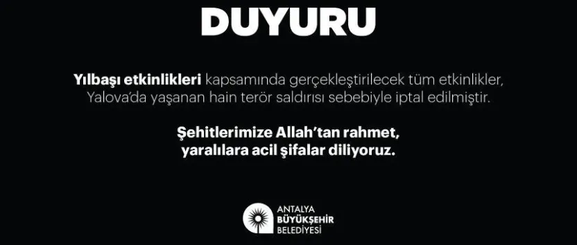 Yalova’da DEAŞ’a yönelik operasyonda 3 polisin şehit olması, 8’i polis biri güvenlik görevlisi olmak üzere 9 kişinin yaralanmasının ardından Antalya Büyükşehir Belediyesi, yılbaşı kapsamında planlanan tüm etkinlikleri iptal ettiğini duyurdu. Antalya Büyükşehir Belediyesi tarafından yapılan yazılı açıklamada, Yalova’da yaşanan terör saldırısı nedeniyle yılbaşı etkinliklerinin iptal edildiği belirtilerek, “Şehitlerimize Allah’tan rahmet, yaralılarımıza acil şifalar diliyoruz” ifadelerine yer verdi.