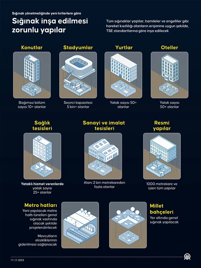 Yeni yönetmelik, metro tünelleri ve millet bahçelerinin de genel sığınak vasfına uygun şekilde projelendirilmesini öngörüyor. AVM’lerin ve otoparkların bodrum katları da artık sığınak olarak kullanılabilecek; mevcut yapılar ise 31 Aralık 2028’e kadar bu standartlara uygun hale getirilecek. /TURİZM GÜNCEL