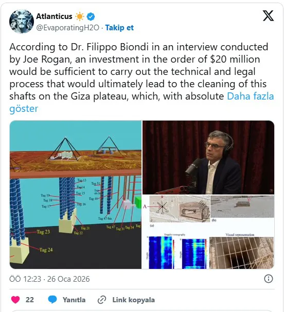 Dünyanın en eski ve en gizemli yapıları arasında yer alan Giza Piramitleri, son dönemde yeniden uluslararası tartışmaların merkezine oturdu. ABD’li ünlü yayıncı Joe Rogan, son podcast bölümünde İtalyan bilim insanı Filippo Biondi ve ekibinin Giza Platosu’nda gerçekleştirdiği tartışmalı radar taramalarına değindi.