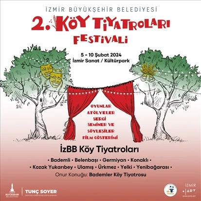 İzmir’de 11 noktada 200’e yakın katılımcısıyla, kırsaldaki insanların yaşamına dokunan İzmir Büyükşehir Belediyesi Köy Tiyatroları, “2. Köy Tiyatroları Festivali”yle sanatseverleri tiyatronun büyülü dünyasına davet ediyor. Festival, 5-10 Şubat tarihlerinde Kültürpark İzmir Sanat Merkezi’nde atölyeler, söyleşiler, film gösterimi ve oyunlarla seyircisiyle buluşacak. 5 Şubat 2024 Pazartesi günü 16.30’da İzBB Köy Tiyatroları Fotoğraf Sergisi açılışı ve 17.30’da “Ulamış Köy Tiyatrosu” belgesel gösterimi ardından film yönetmeni Berkay Taşkan söyleşisi var. İzmir Büyükşehir Belediyesi Ulamış Köy Tiyatrosu’nun “Yolda Buldum Kendimi” adlı oyunu, açılış gününde saat 20.00’de seyircisiyle buluşacak. Aynı gece İzmir Büyükşehir Belediyesi Köy Tiyatrolarının katılımcılarından Gülsüm Güldüren’in yazdığı “Muhtar Oyu’nu” adlı oyun sahne alacak.