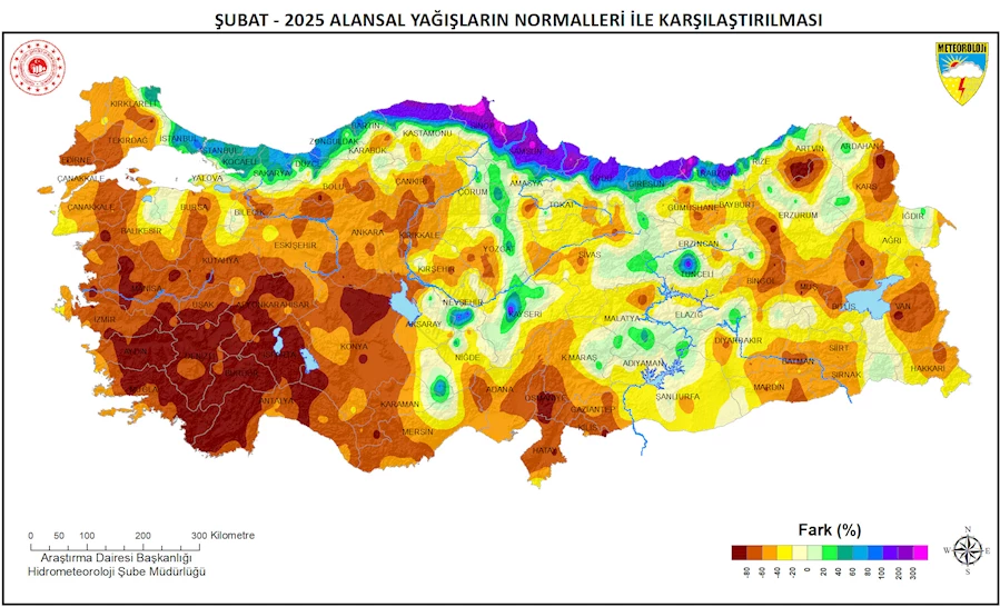 Diğer yandan, Meteoroloji Genel Müdürlüğü'nün kuraklık analiz raporlarına göre şubat ayında Akdeniz ve Ege bölgelerinin tamamı, İç Anadolu ve Güneydoğu Anadolu bölgelerinin de önemli bölümünde 'şiddetli kuraklık' görülüyor. Marmara'da ise Tekirdağ için 'şiddetli kuraklık' gösterildi. 2025 şubat ayı yağışı normalin altında, geçen yılın şubat ayının ise üzerinde gerçekleşti. Şubat ayı normali (1991-2020) 59,8 kg iken bu yıl metrekareye 40 kg ortalama yağış düştü. Yağışlarda normaline göre yüzde 33 azalma yaşandı.