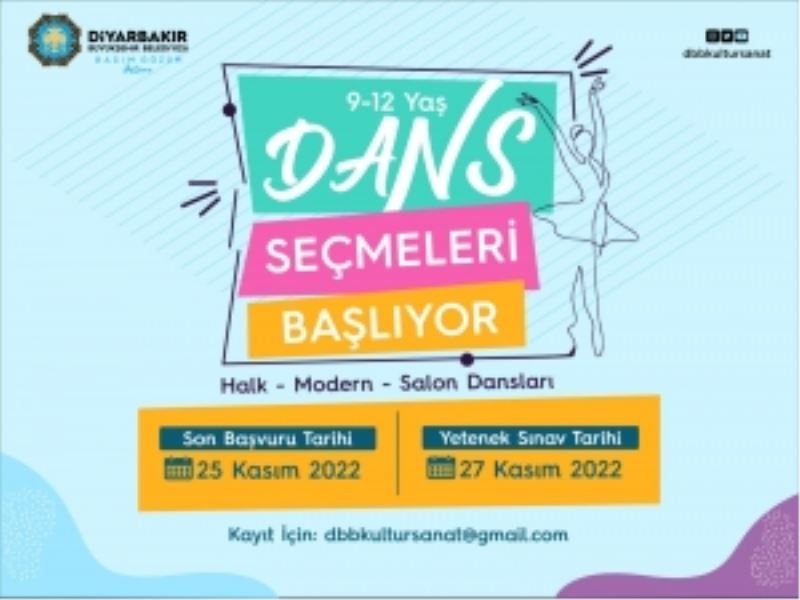 Diyarbakır Büyükşehir Belediyesi’nin, 9-12 yaş aralığındaki çocukların dans yeteneklerini açığa çıkarmak ve geliştirmek amacıyla açacağı kurslar için düzenleyeceği seçmelere başvurular başladı.