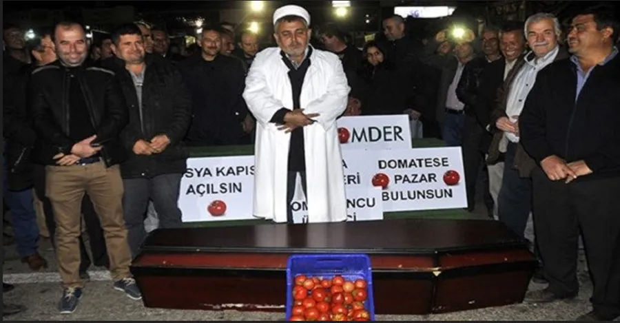 Sözde imam İsa Yıldırım, üreticilerle birlikte içinde domates bulunan tabut önünde temsili cenaze namazı kıldırmıştı.