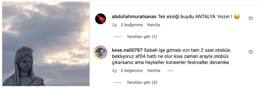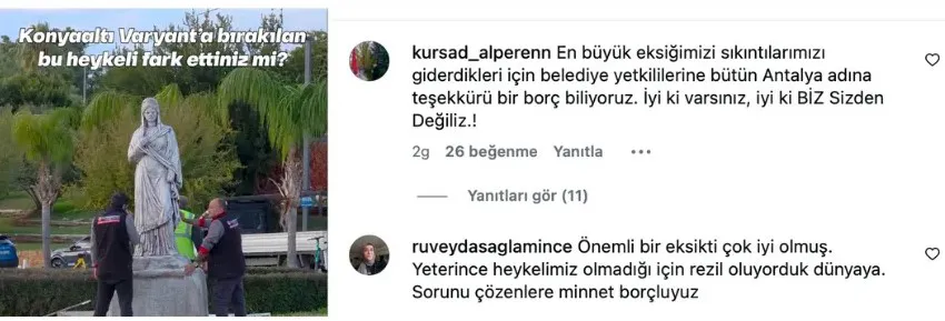 Paylaşımların altına yorum yağdı. Sosyal medyada yer alan bazı yorumlar ise tartışmanın büyümesine yol açtı. Heykeli belediyenin yaptığını sanan kullanıcılar, “Ancak heykel yaparlar, yol yapana çene yaparlar”, “CHP’nin tek yapacağı iş heykel yapmak”, “Heykel sevdasından vazgeçmediler” şeklinde eleştiriler paylaştı.