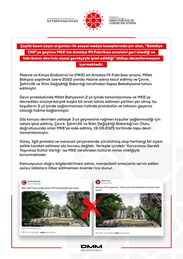 DMM'nin NSosyal'deki hesabından yapılan açıklamada, çeşitli basın yayın organları ile sosyal medya hesaplarında yer alan "Belediye, CHP'ye geçince MKE'nin Antalya Pil Fabrikası arazisini geri istediği ve fabrikanın devrinin siyasi gerekçeyle iptal edildiği" iddiasının dezenformasyon içerdiği belirtildi.