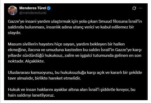 Gazze’de yaşanılan zulme dur demek ve destek vermek için yola çıkan Küresel Sumud Filosu'nun çok sayıda gemisi İsrail ablukasına alındı ve durduruldu. Buna rağmen yılmadan ve korkmadan Gazze için yoluna devam ediyor. Filonun gemilerinin durdurulmasına ise dünyanı her noktasından tepkiler yağmaya başladı. Sosyal medyalarda kişisel hesaplardan yapılan tepki paylaşımlarına Eski Antalya Büyükşehir Belediye Başkanı Menderes Türel’de dahil oldu.