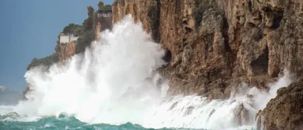 Meteoroloji'nin 'turuncu kodla' uyardığı Antalya'da sabah saatlerinden itibaren etkisin gösteren fırtına, hayatı felç etti. Rüzgarın hızının 60 km'yi bulduğu kentte birçok uçak seferi iptal edildi, falezlere çarpan dev dalgalar ise 30 metreye kadar yükseldi.