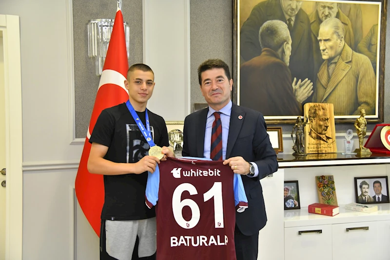 Şampiyon Baturalp’e Trabzonspor forması hediye eden Başkan Kaya, aynı zamanda antrenörü olan babası Gökhan Çevik’i de tebrik etti.