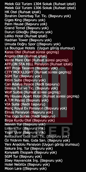 Halen 2634 sayılı kanunun ilgili hükmüne muhalefet ederek bakanlıktan yasal süresi içerisinde Turizm İşletme Belgesi almadan veya iş yeri açma ve çalışma ruhsatı olmaksızın veya iş yeri açma ve çalışma ruhsatı iptal edilmiş olmasına rağmen halen kayıt dışı turizm faaliyeti gösteren konaklama işletmeleri olduğu belirtilerek, bunların listesi de gönderildi.
