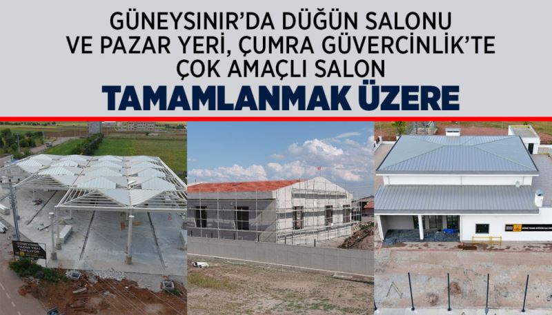 Konya Büyükşehir Belediyesi tarafından Güneysınır’a kazandırılacak pazar yeri ve düğün salonu ile Çumra Güvercinlik Mahallesi’ne kazandırılacak çok amaçlı salonun inşaatları son aşamaya geldi.