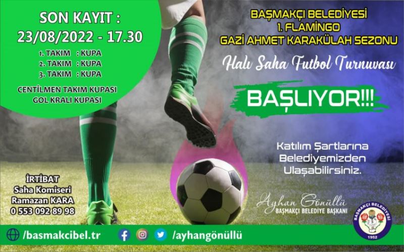 Başmakçı Belediye Başkanımız Ayhan GÖNÜLLÜ’ nün Katkılarıyla Başmakçı Halı Sahasında Futbol Turnuvası Başlayacaktır. Turnuvaya Katılmak İsteyenler Katılım Şartlarını Aşağıdaki Telefon Numaralarından Öğrenebilirler.